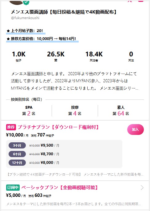 myfans博主メンエス覆面講師@fukumenkoushi原档4K付费订阅视频合集549部,价值5500日元(含税)订阅,折合RMB257元,原档高清视频无任何第三方水印,也无本站水印(实在太多懒得加了)。男士约美女技师按摩啪啪,多个极品人妻OL大学生等,有些视频是多角度拍摄,这个主题还是第一次上架,很有看点,值得收藏。